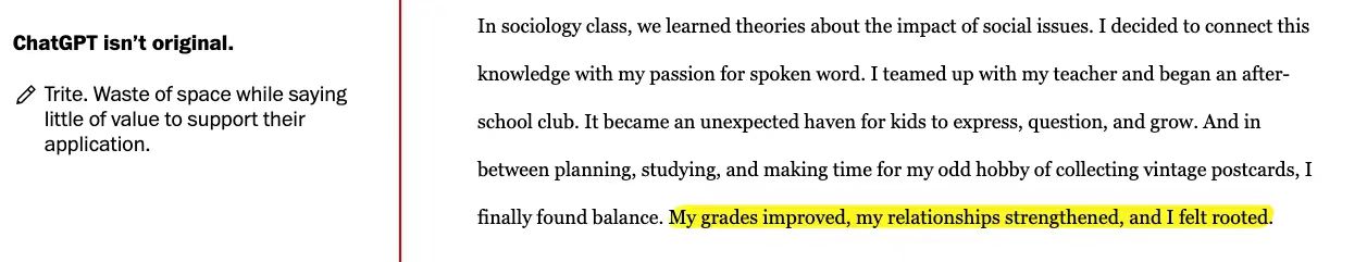 在此过程中发现 ChatGPT 撰写的文书的 弊端 :通常缺乏具体细节,导致文章缺乏支持其观点的证据。文笔平淡,用陈词滥调来解释情况,而不是深入探讨作者的情感经历。 这些文章往往是重复的、可预测的,让读者没有惊喜,也没有对作者的旅程有任何感觉。