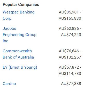 雇主公司 :澳大利亚国家银行 NAB ;澳新银行 ANZ ;安永会计师事务所; Telstra ; IBM ;
