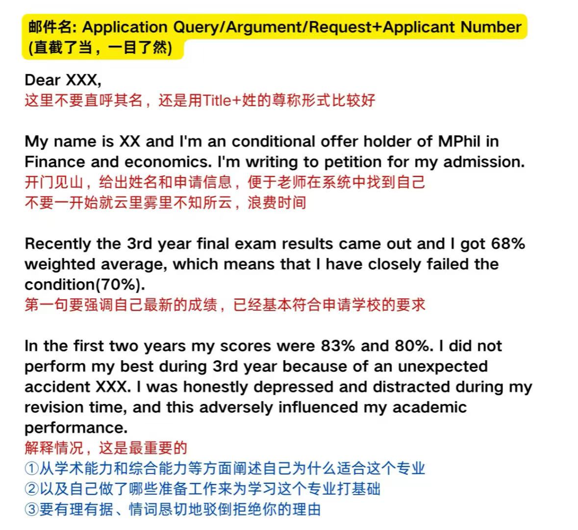 开门见山,直截了当,邮件名用 application argument+姓名 +申请号(避免被当垃圾邮件)。