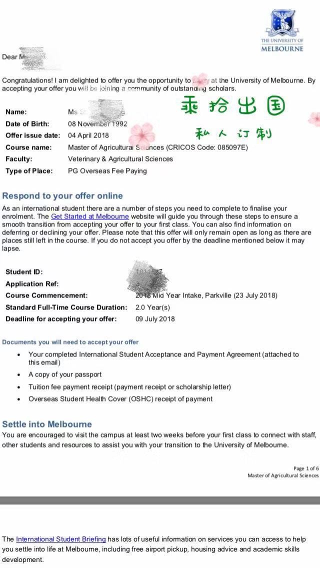 录取结果:成功拿到墨尔本大学、昆士兰大学和阿德莱德大学的offer(阿大获得奖学金)。