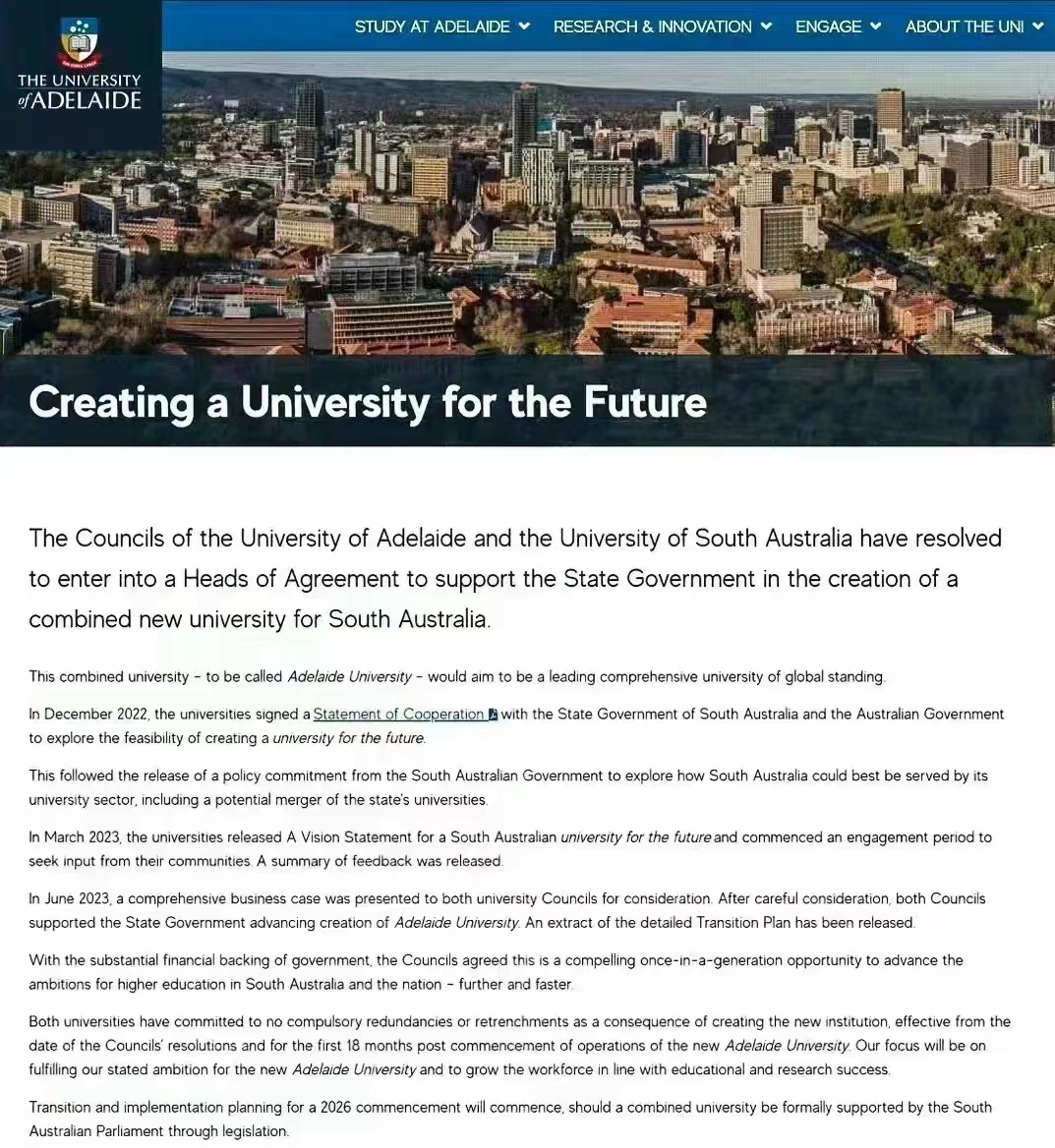 阿德萊德大學髮佈聲明,確認與南澳大利亞大學閤併