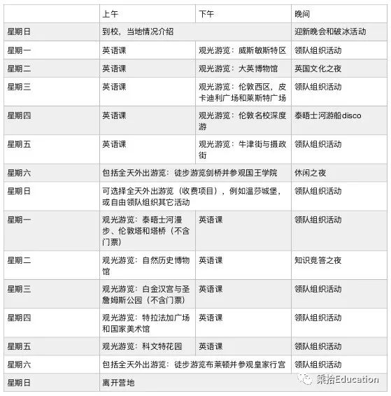 移動課堂:1次全天外齣遊覽(乘坐大巴)、5次倫敦市區觀光遊覽(步行或乘地鐵)、3次晚間活動、提供公交卡週卡