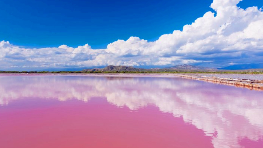 著名的美景粉紅湖併不是湖泊,而是一片沙丘圍成的鹽田。由於湖中藻類産生瞭豐富的β - 鬍蘿蔔素,纔形成瞭玫瑰般的粉色。