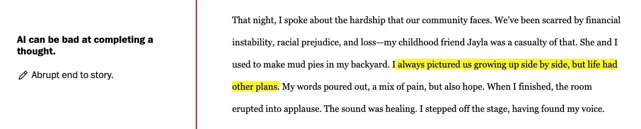 在此過程中髮現 ChatGPT 撰寫的文書的 弊端 :通常缺乏具體細節,導緻文章缺乏支持其觀點的證據。文筆平淡,用陳詞濫調來解釋情況,而不是深入探討作者的情感經歷。 這些文章往往是重覆的、可預測的,讓讀者沒有驚喜,也沒有對作者的旅程有任何感覺。