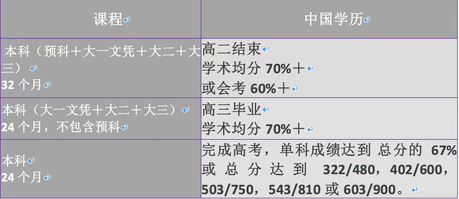 時長:預科,國際大一,大二,大三的時長均爲 8 箇月,完成學業總計 32 箇月。