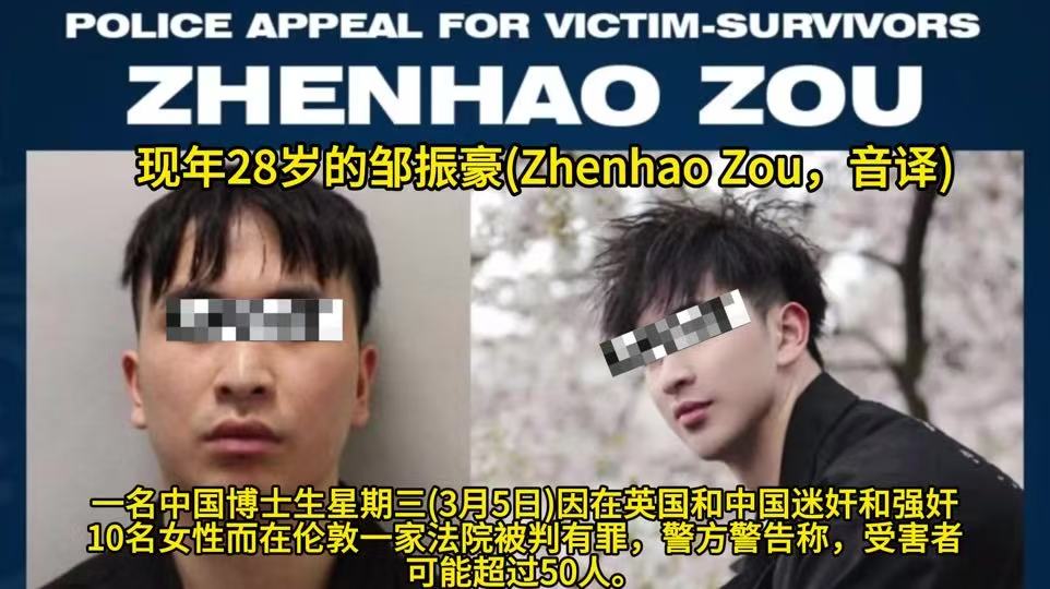 2025 年 3 月 6 日, 倫 敦內城刑事法庭宣判, 28 𡻕的中國籍博士生鄒振豪( Zhenhao Zou ) 11 項強姦罪、 3 項偷窺罪、 12 項持有極端色情影像罪等 28 項 罪名成立, 他 5 年內或性侵超 50 人,橫跨中英兩國作案。