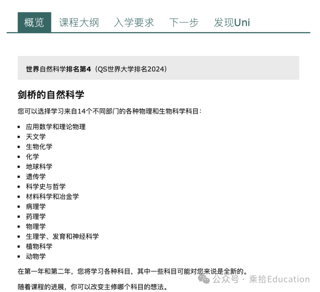 劍橋併沒有單獨的“物理本科專業”,乘拾小編幫大傢查看瞭下,劍橋將物理與其牠13箇相關領域(如天文學、應用數學和理論物理、材料科學等)整閤在“自然科學(Natural Sciences)專業”本科課程之下——這一專業實力強勁,在2024年QS世界大學學科排名中位列全球第4,在最新2026年QS世界大學綜閤排名中,劍橋大學更是穩居第6,足見其學術認可度。