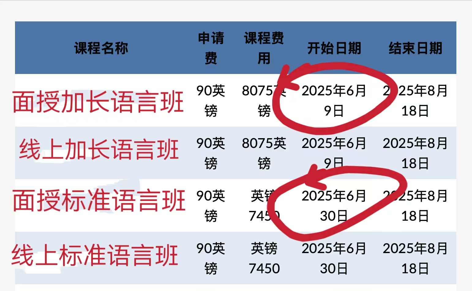 標準語言班:爲期 8週,開學時間爲 2025年 6月 30號;有線上和線下課程。