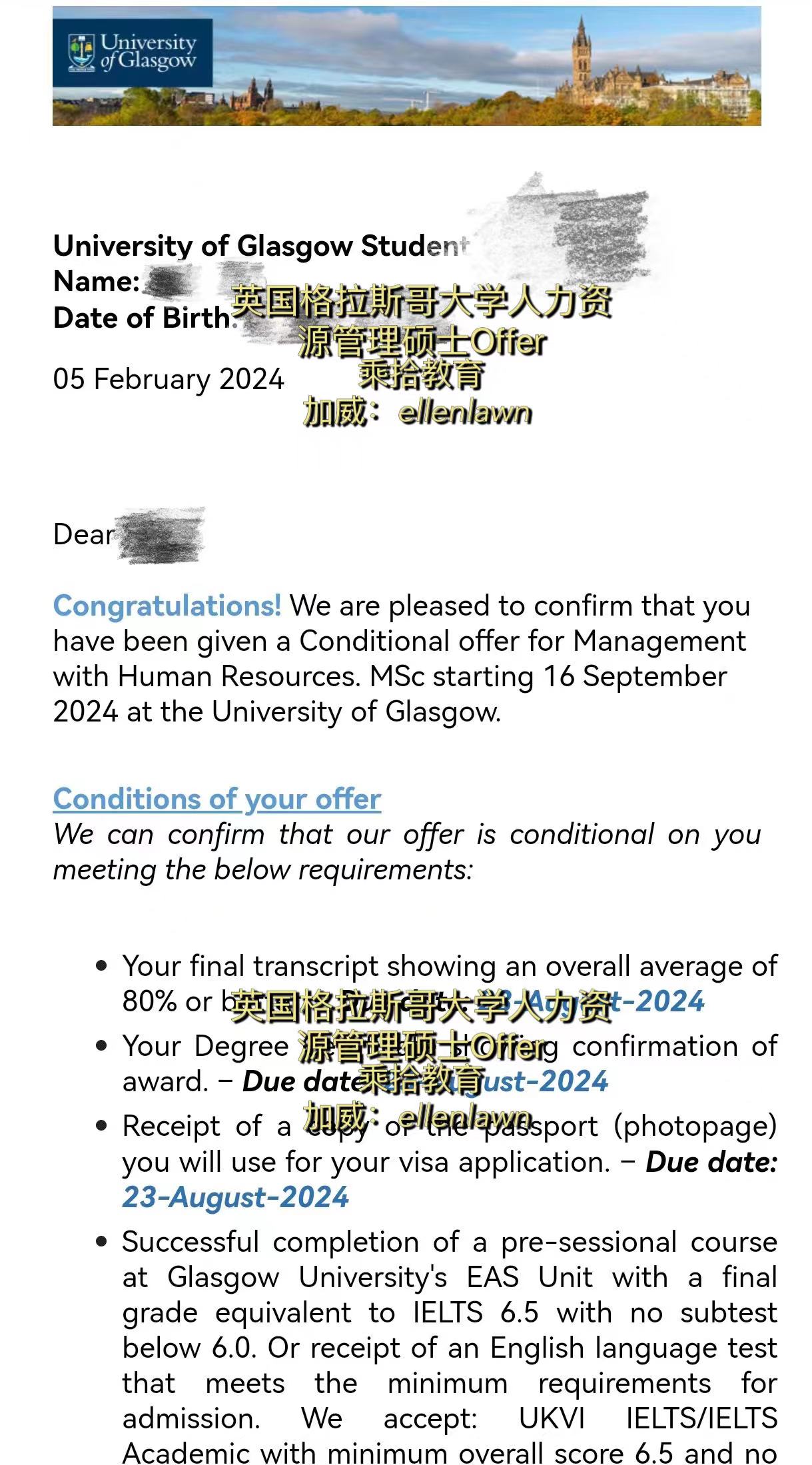 閆衕學斬穫英國格拉斯哥大學人力資源管理碩士offer!